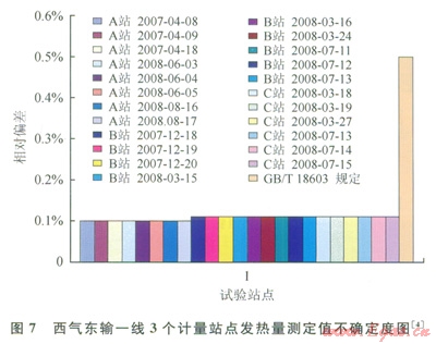 2007年在西氣東輸一線選擇3個不同的A級計量站(大于等于5×104m3/h)作為天然氣能量計量技術應用試點,試驗時間3個月。3個計量站點高位發(fā)熱量測定的不確定度均在0.1%左右,達到68/T 18603對A級計量站的準確度要求(圖7),表明長輸管線計量站已基本達到能量計量體系應用的要求[4]。
