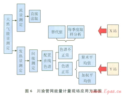 以輸氣管網(wǎng)特點、輸氣規(guī)模、用戶情況、計量檢測設備配置為試驗站。電選擇原則?,F(xiàn)場實驗充分考慮氣質變化的情況,經過一年的試驗時間,通過合理性檢驗、有效性檢驗、發(fā)熱量賦值、替代值確定、能量數(shù)據(jù)組合計算、不確定度計算,評估氣質變化對能量值的影響,給出合理的交接計量方案及質量控制和質量保證措施。圖6是川渝管網(wǎng)能量計量現(xiàn)場應用方案。X站:A級站,為氣體輸送商直接向本地分銷商供氣(界面3),工業(yè)及民用氣,在線色譜儀故障,離線分析,應用替代值。Y站:A級站,由一個氣體輸送商向另一氣體輸送商供氣(界面2),在線色譜儀正常,評價發(fā)熱量計算方法。