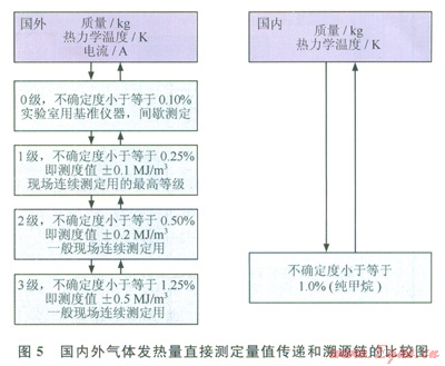 我國的水流式熱量計標準裝置不確定度小于等于1.0%(純甲烷,置信度U=0.95,包含因子k=2)。中國石油天然氣質量控制和能量計量重點實驗室正在研制的天然氣發(fā)熱量直接測量裝置,測量不確定度為0.20%~0.25%(U=0.95,k=2),達到ISO 15971:2008.Natural gas-Measurement of Properties-Calorific Value and Wobbc Index確定的1級水平[4,8],滿足現(xiàn)場發(fā)熱量測定值的核查。圖5是國內外氣體發(fā)熱量直接測定量值傳遞和溯源鏈的比較[4]。