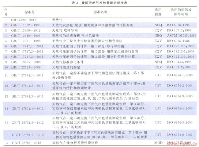我國等同和修改采用ISO、EN、AGA及ASTM標準發(fā)布29項取樣、組成分析、發(fā)熱量和流量測量、能量測定、量值溯源方法的國家和行業(yè)標準(表2、3),初步建立與國際接軌、達到國際先進水平的能量計量標準體系。GB/T l8603《天然氣計量系統(tǒng)技術要求》和GB/T 22723《天然氣能量的測定》是能量計量兩個核心標準。