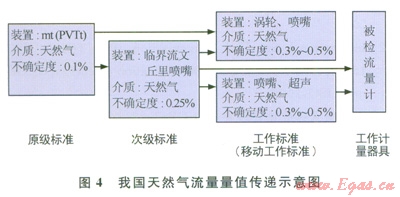 我國建設了原級標準裝置、次級標準裝置、工作標準裝置、移動標準裝置,建立了完整的流量量值動態(tài)溯源鏈(圖4)。國家石油天然氣大流量成都和南京分站共同構成完整的低、中和高壓體積流量量值傳遞和溯源鏈。成都和南京分站的質量時間(mt)法原級標準裝置,不確定度優(yōu)于0.10%。成都分站擴容改造后,將建立中低壓(0.3~6.0MPa)、質量流量不確定度達到(0.05%~0.076%)的原級標準裝置。同時成都分站正新建環(huán)道檢測系統(tǒng)作為工作標準,將現(xiàn)有臨界流文丘里噴嘴次級標準裝置從不確定度0.33%水平提高到小于等于0.20%。