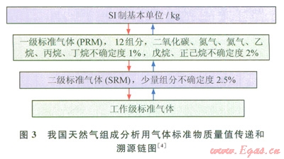 我國氣體標準物質是作為計量器具施行法制管理,分為國家一級和國家二級,國家一級代表我國最高水平。我國已經初步形成的天然氣分析用氣體標準物質量值傳遞和溯源鏈[4](圖3)。目前已建立與國際一致的稱量法、分壓法等氣體標準物質制備技術,形成了4種二元組分的國家一級氣體標準物質,3個單濃度點的多組分國家一級氣體標準物質,少量組分不確定度小于等于l%,戊烷和己烷小于等于2%。另外還研制了10余個國家二級氣體標準物質,少量組分不確定度小于等于2.5%。