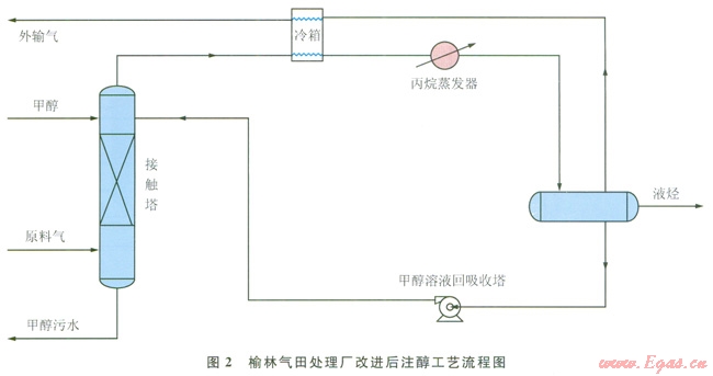 改進(jìn)后的注醇工藝甲醇溶液回流接觸塔形成了循環(huán)注醇過程,實(shí)際上,補(bǔ)充注入的醇是被天然氣帶止而損失的一小部分甲醇,這樣便大大提高了甲醇的利用率。