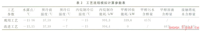 現(xiàn)用注醇工藝流程模擬與改進(jìn)后注醇工藝流程模擬原料氣的溫度、壓力、流量以及原料氣組成完全相同,而且保持板翅換熱器與丙烷蒸發(fā)器的溫降也相同。與此同時,現(xiàn)用注醇工藝與改進(jìn)后注醇工藝外輸干氣的露點(diǎn)分別為-l5.16℃和-15.15℃,幾乎相同,在保證沒有天然氣水合物形成、取最小注醇量的基礎(chǔ)上對兩種工藝進(jìn)行對比分析,工藝參數(shù)對比見表2。