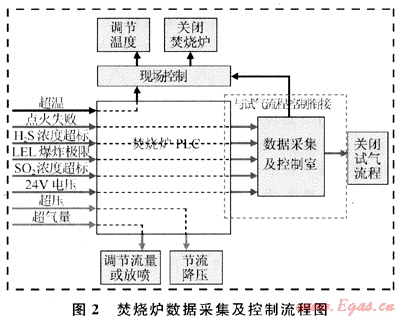 當(dāng)焚燒爐2套點(diǎn)火系統(tǒng)點(diǎn)火失敗、監(jiān)測(cè)點(diǎn)可燃?xì)怏w達(dá)到爆炸極限或者SO2、H2S濃度超標(biāo)時(shí),焚燒爐控制系統(tǒng)將向井場(chǎng)數(shù)據(jù)采集控制系統(tǒng)發(fā)出緊急關(guān)斷報(bào)警信號(hào),并關(guān)閉井口;當(dāng)超溫、超壓或超氣量時(shí),焚燒爐控制系統(tǒng)將向井場(chǎng)數(shù)據(jù)采集控制系統(tǒng)發(fā)出緊急關(guān)斷報(bào)警信號(hào),并進(jìn)行調(diào)節(jié)[3~6]。具體邏輯控制流程見圖2。