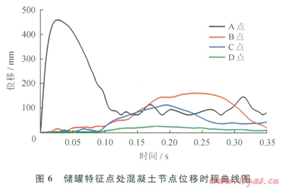 圖6為儲罐特征點A~D處混凝土節(jié)點位移時程曲線,E、F兩處位移響應較小,此處未予列出。從圖6中可以看出,A點穹頂處最大位移達到了458mm,出現(xiàn)在25ms左右,說明穹頂處變形并不是在爆炸瞬間達到了最大位移響應,而是有一個逐漸變形的過程,最后其變形維持在100mm左右波動,證明穹頂各處發(fā)生了不可恢復變形,即穹頂混凝土已經(jīng)發(fā)生塑性破壞。B、C、D 3處的最大變形分別為164mm、113mm和27mm,各處均存在不同程度的殘余變形,但其值均較小,不影響結(jié)構(gòu)的整體安全?,F(xiàn)行國外規(guī)范并未對穹頂撓度限制有詳細規(guī)定,參考我國《混凝土結(jié)構(gòu)設(shè)計規(guī)范》[17]中的規(guī)定,穹頂處撓度限制應小于l0/400,即80000/400=200mm。從以上分析中可以看出,穹頂處撓度已超過該值,雖未引起破壞,但結(jié)合其他數(shù)據(jù)可以看出基本已達到其承載力極限。