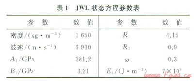 式中p為壓力;V為相對體積;E0為初始比內(nèi)能,A1、B1、R1、R2、w為材料常數(shù)。