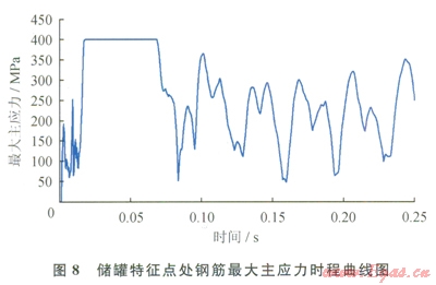 儲罐部分特征點B處鋼筋最大主應力時程曲線如圖8所示,由于爆心處A點的鋼筋瞬間即達到設(shè)定的應變極限不具代表性,故此處并未示出。圖8顯示B點的鋼筋一直處于較高的應力水平,最大應力已達到400MPa,但是未達到設(shè)置的應變極限0.05,故尚未破壞,初始爆炸沖量并未使其到達應力極值,后續(xù)的空氣沖擊波持續(xù)作用使其應力逐漸增加。外罐鋼筋除爆心處發(fā)生破壞外,其余部分即使有瞬間到達應力限值,但未達到設(shè)定的應變極限,總體來說,外罐鋼筋應力響應較安全。