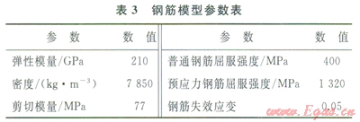 混凝土采用Johnson-Holmquit本構(gòu)模型,模型參數(shù)見表2。該模型因綜合考慮了損傷、應變率、靜水壓以及壓碎、壓實效應,適合大應變、高應變率和高靜水壓情況,被廣泛地應用于混凝土撞擊、侵徹和爆炸等強動載問題的數(shù)值模擬。鋼筋材料模型采用雙線性隨動硬化模型,用兩個斜率(彈性和塑性)來表示鋼筋的應力應變特性,具體參數(shù)見表3。