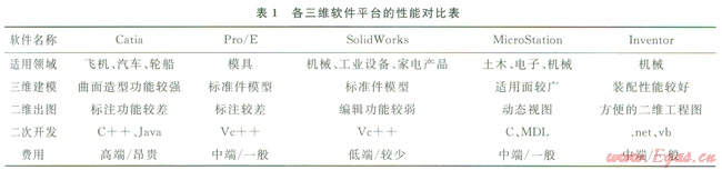 針對所要開發(fā)的系統(tǒng)功能要具有:①參數(shù)化的模型庫;②模型庫設(shè)備的添加、瀏覽、刪除、編輯等;③自動管路設(shè)計;④材料表統(tǒng)計;⑤自動出圖;⑥有限元分析接口以及ROV的干涉檢測等。通過表l和圖l對Inventor、Catia、SolidWorks、Pro/E和Microstation等常用三維建模軟件平臺的用戶數(shù)量、適用領(lǐng)域、功能特點以及其經(jīng)濟性等數(shù)據(jù)進行比較,最終選取了Autodesk Inventor作為水下生產(chǎn)虛擬仿真設(shè)計系統(tǒng)的開發(fā)平臺。