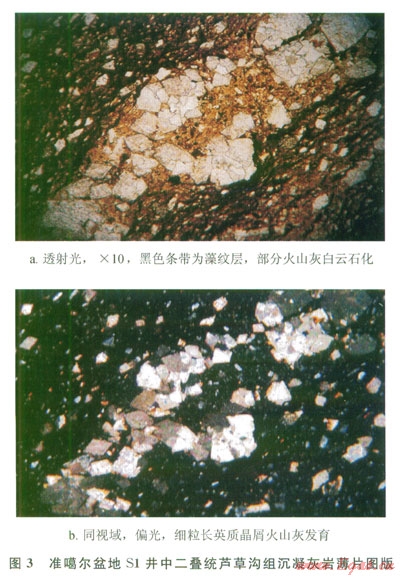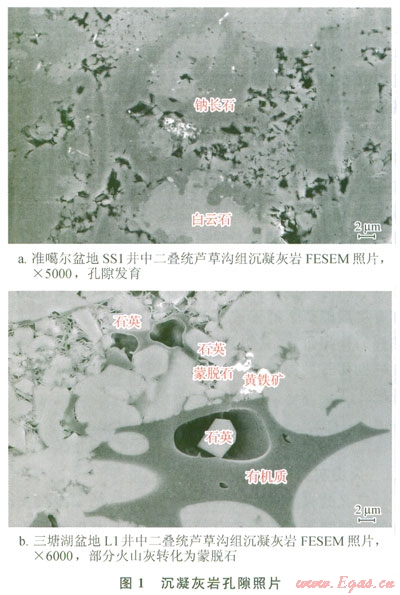 火山灰交代蝕變等成巖作用,不僅能形成大量的次生孔隙(圖1),改善頁巖油氣層的物性,而且火山灰形成的凝灰?guī)r、沉凝灰?guī)r、凝灰質(zhì)泥巖等巖層還能成為頁巖油氣的有效儲層。另外,火山灰含有大量鈾、釷等放射性元素,可加速有機(jī)質(zhì)的熱解,對頁巖油氣的生成具有積極意義[15-16]。