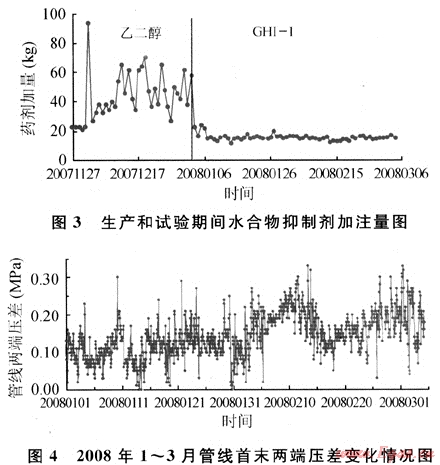 從現(xiàn)場試驗結果來看,除2007年12月2日由于乙二醇加量不足,導致管線發(fā)生冰堵之外,試驗期間生產管線運行平穩(wěn),未發(fā)生冰堵現(xiàn)象,管線首末兩端壓差較低,清管通球順利,未出現(xiàn)卡球憋壓現(xiàn)象,清管時管內排出的水合物冰渣細小、疏松,且總量較少,清管周期延長,超過15d。清管通球情況見表3所示。