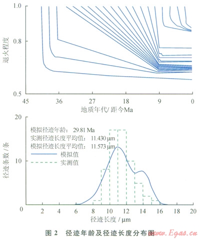 磷灰石裂變徑跡法的熱史模擬步驟為:①根據(jù)已有熱參數(shù)資料,給出熱史約束條件;②設(shè)定大量的溫度時(shí)間曲線,通過正演求出徑跡長度、徑跡年齡模擬值;③將正演結(jié)果與實(shí)測徑跡長度、年齡進(jìn)行比較,獲得最佳模型,即得到熱史模擬結(jié)果。