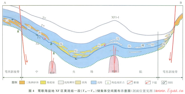 1)鶯歌海盆地XF區(qū)黃流組一段沉積時(shí)期,受到東部海南隆起區(qū)、西部昆嵩隆起區(qū)2個(gè)物源體系的影響。以藍(lán)江水系為主的昆嵩隆起物源區(qū)的沉積物,推進(jìn)到XFl-l構(gòu)造西側(cè),形成海底扇水道砂復(fù)合體,以昌化江水系為主的海南隆起物源區(qū)沉積物僅到達(dá)XFl-1構(gòu)造東部,形成規(guī)模較小的灘壩。