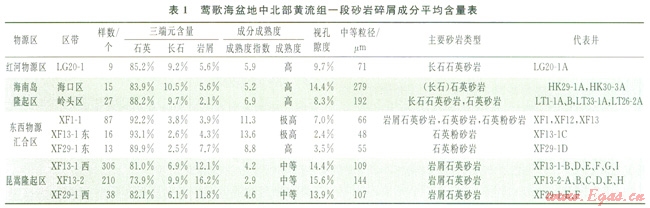 表1顯示,盆地中北部黃流組一段時(shí)期總體上以石英砂巖類為主,但不同區(qū)帶的長(zhǎng)石、巖屑含量有差異。鶯東斜坡??趨^(qū)、嶺頭區(qū)長(zhǎng)石平均含量介于9.7%~10.5%,巖屑平均含量介于2.8%~5.8%,以長(zhǎng)石石英砂巖為主,反映以花崗巖為主的海南隆起區(qū)物源性質(zhì);西北部的LG20-1構(gòu)造,其石英、長(zhǎng)石、巖屑含量與鶯東斜坡???、嶺頭區(qū)相近,仍以長(zhǎng)石石英砂巖為主,但其粒度偏細(xì)(平均粒度中值為71mm),為極細(xì)砂,反映離物源區(qū)較遠(yuǎn),從其地理位置來(lái)看應(yīng)屬紅河物源體系;XFl3-2氣田、XFl3-1氣田西部、XF29-1構(gòu)造西部則以巖屑石英砂巖較為多見(jiàn),巖屑平均含量介于11.8%~l6.2%(主要為片巖、千枚巖、變質(zhì)砂巖),中等成分成熟度,反映西部昆嵩隆起區(qū)含較多變質(zhì)巖類物源特征;而XFl、XFl2、XFl3、XFl3-1C、XF29-1D井砂巖,粒度細(xì)(粒度中值介于48~66mm),長(zhǎng)石、巖屑含量低,平均含量分別為2.5%~3.8%、3.9%~7.7%,石英含量極高(大于90%),多為石英粉砂巖,成熟度指數(shù)介于8.8~13.6,屬高極高成分成熟度,反映這些井區(qū)沉積物經(jīng)過(guò)較長(zhǎng)距離的搬運(yùn)。