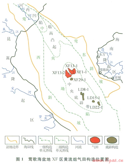 鶯歌海盆地位于我國(guó)海南島與越南之間海域,呈北西向展布,面積約為ll.3×104km2,為典型的欠壓實(shí)型高溫高壓新生代含油氣盆地。XF區(qū)位于鶯歌海盆地中北部底辟帶上,繼20世紀(jì)90年代發(fā)現(xiàn)XFl-1淺層氣田(上新統(tǒng)鶯歌海組二段)后,近期中深層(22中新統(tǒng)黃流組)勘探中又相繼發(fā)現(xiàn)了XFl3-1、XFl3-2大型巖性+構(gòu)造復(fù)合型氣田。儲(chǔ)層砂巖體類型在平面上分異明顯,不同類型砂巖體厚度變化大;儲(chǔ)層非均質(zhì)性明顯,中孔、高滲至低孔、特低滲儲(chǔ)層均有出現(xiàn),反映了XF區(qū)物源方向的差異性。