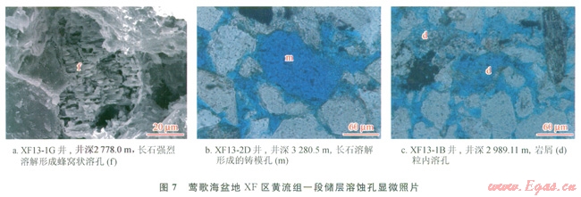 上述分析表明,XF區(qū)黃流組一段儲(chǔ)層除沉積相、成巖作用影響外[4],與物源區(qū)有密切關(guān)系的碎屑組分也是影響儲(chǔ)層質(zhì)量的一個(gè)關(guān)鍵因素。這是由于巖石在深埋過(guò)程中,石英組分穩(wěn)定,不易被酸性流體溶蝕,而長(zhǎng)石、巖屑等不穩(wěn)定組分容易發(fā)生溶解,形成各種溶蝕孔(圖7),增加了儲(chǔ)集層孔隙性,同時(shí)因溶解作用強(qiáng)烈時(shí)形成伸長(zhǎng)狀孔、超大孔可改造孔隙的連通性,提高儲(chǔ)集層滲透率[4]。