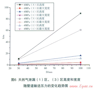 DN900在運(yùn)行壓力6.0MPa,輸氣能力為74.3萬(wàn)m3/h的高壓天然氣輸送管道(管壁厚度l0mm),埋地深度1.2m,泄漏點(diǎn)孔徑30mm時(shí),天然氣泄漏口速度較大,屬超聲速天然氣氣流在空氣中的射流擴(kuò)散,因此,在高度方向的擴(kuò)散遠(yuǎn)大于在水平方面的擴(kuò)散。如圖4所示,在泄漏5s時(shí),天然氣高度已達(dá)150m;25s天然氣已擴(kuò)散至大于250m的高空;50s其在250m下的空間擴(kuò)散形狀趨于定常,即形狀隨時(shí)間推移基本一致。圖5給出了泄漏口l00mm、30mm條件下天然氣泄漏(1)區(qū)、(3)高度和寬度隨輸送壓力的變化曲線圖。從模擬計(jì)算結(jié)果可以看出,隨著輸送壓力的增大,在相同泄漏口條件下,泄漏天然氣流量增大,導(dǎo)致(1)區(qū)、(3)高度和寬度增大。圖6給出了天然氣泄漏(1)區(qū)、(3)高度和寬度隨泄漏口直徑的變化趨勢(shì)圖,圖中表明:在相同輸送壓力下,泄漏口直徑增大,相當(dāng)于泄漏天然氣流量增大,導(dǎo)致(1)區(qū)、(3)高度和寬度增大。