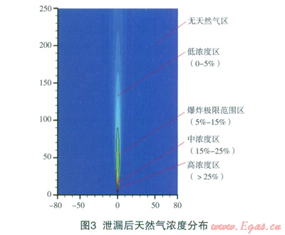 天然氣中高壓輸送管道泄漏后,無(wú)風(fēng)條件下,在大氣中以射流的方式存在(如圖3所示)。根據(jù)其爆炸性,可以分為4個(gè)區(qū)域:(1)高天然氣濃度區(qū):當(dāng)空氣中天然氣濃度達(dá)25%~30%時(shí),可引起頭痛、頭暈、乏力、注意力不集中、呼吸和心跳加速、共濟(jì)失調(diào)。若不及時(shí)脫離,可致窒息死亡。當(dāng)濃度大于30%,在較短的時(shí)間內(nèi)就會(huì)窒息死亡;(2)中濃度區(qū)(15%~25%);(3)爆炸極限范圍區(qū)(5%~15%):在該濃度范圍內(nèi),遇熱源、明火或其它點(diǎn)火源有燃燒爆炸危險(xiǎn);(4)低天然氣濃度區(qū):