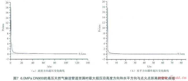 泄漏天然氣發(fā)生燃燒爆炸時(shí),爆炸氣云將形成巨大破壞作用的爆炸超壓,當(dāng)超壓0.1atm時(shí),就可造成橋梁、救生艇等破壞;當(dāng)超壓0.35atm時(shí),可以將戶外人員吹走或埋入廢墟,具有50%的致命率,可嚴(yán)重破壞建筑物或工廠。通常以超壓0.1atm作為危險(xiǎn)的臨界條件。圖7給出了DN900運(yùn)行壓力6.0MPa,輸氣能力為74.3萬(wàn)m3/h的高壓天然氣輸送管道泄漏點(diǎn)孔徑100mm,泄漏時(shí)間10min條件下,氣云爆炸最大超壓隨高度以及水平距離的變化曲線。圖中計(jì)算結(jié)果表明:在初始點(diǎn)火后,迅速形成爆轟,并達(dá)到約l8atm的超壓;隨著高度的增加,超壓先明顯衰減,隨后緩慢衰減,大約距地面66.5m高度超壓衰減至0.1atm。水平方向,在點(diǎn)火點(diǎn)附近,由于爆轟的存在,超壓高至約l8atm左右;隨著遠(yuǎn)離點(diǎn)火點(diǎn),超壓也是先明顯衰減,隨后緩慢衰減,在距離點(diǎn)火點(diǎn)l5.6m處,超壓降至0.1atm。