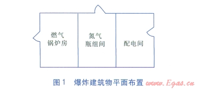 2012年6月某燃?xì)鉄犭姀S發(fā)生爆炸,造成兩死一傷。爆炸地點位于燃?xì)怆姀S內(nèi)的一座附屬建筑物(現(xiàn)澆框架式結(jié)構(gòu))內(nèi),爆炸建筑物平面布置見圖1。監(jiān)控錄像顯示,爆炸發(fā)生前有兩名人員先后進入配電間,2min后發(fā)生爆炸,爆炸沖擊波半徑超過30m。約l5min后消防及救援人員趕到現(xiàn)場,使用消火栓撲滅零星明火。事故現(xiàn)場勘察顯示,配電間3面外墻向外坍塌,建筑物內(nèi)2面隔墻均向燃?xì)忮仩t房方向垮塌。配電間內(nèi)有兩排配電柜,無超大型變壓器設(shè)備,多個配電柜門被炸飛,配電柜內(nèi)有燒結(jié)痕跡。氮氣瓶、氮氣匯流管及安全放散管(放散口設(shè)置在室內(nèi))傾倒在燃?xì)忮仩t房與氮氣瓶組間之間的隔墻一側(cè),放散口有積碳現(xiàn)象,放散口上方墻體有噴射火焰燃燒過的痕跡。