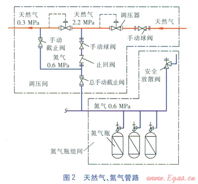 燃?xì)鉄犭姀S內(nèi)的氮氣供應(yīng)系統(tǒng)用于天然氣管道置換,氮氣瓶組間與天然氣調(diào)壓間相隔僅30m左右,天然氣、氮氣管路見圖2。