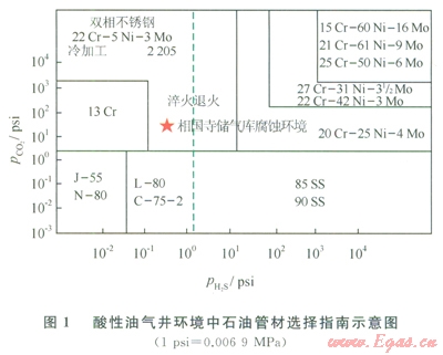 在相國(guó)寺儲(chǔ)氣庫(kù)運(yùn)行初期還存在少量H2S,其分壓為0.0028MPa,根據(jù)酸性油氣井環(huán)境石油管材選擇指南[7](圖1),可以看出3Cr材質(zhì)不是相國(guó)寺儲(chǔ)氣庫(kù)腐蝕環(huán)境下最優(yōu)選擇。根據(jù)相關(guān)實(shí)驗(yàn)結(jié)果[8],在溫度為l00℃和ll0℃,CO2分壓為0.03MPa和1.488MPa條件下,3Cr材質(zhì)平均點(diǎn)蝕深度0.042mm;最大點(diǎn)蝕深度l.006mmm;最大點(diǎn)蝕速度61.2mm/a。