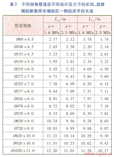 采用前面計算方法,分別計算出農(nóng)田、道路塌陷區(qū)對應(yīng)的上,并將表1數(shù)據(jù)代入式(16),可計算得不同規(guī)格管道在不同設(shè)計壓力下農(nóng)田、道路塌陷斷裂帶非塌陷區(qū)一側(cè)經(jīng)濟(jì)開挖長度Le,t、Le,L,見表2。