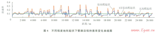 模擬計算得到不同程度地形起伏下凝析氣管道內(nèi)持液率的沿線分布曲線如圖6所示。從圖6可以看出,在無地形起伏的條件下,管路沿程持液率基本保持不變,平均持液率為0.1;而存在地形起伏的情況下(對照圖6和圖3),管內(nèi)持液率隨沿線地形起伏的變化出現(xiàn)了不同幅度的波動,且地形起伏高度越大,持液率波動的幅度也越大,在上坡管段內(nèi)持液率相對較大,下坡管段內(nèi)持液率相對偏小。分析這種地形高差對持液率影響較大的原因是:上升管段內(nèi)流體在爬坡過程中壓降損失比較嚴重,管內(nèi)壓力下降相對較快,氣相體積膨脹,使得氣相流速加快,攜液能力增強,致使持液率隨地形高差的增加而增大;反之亦然。