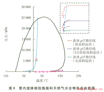 凝析氣混輸管內(nèi)流體的相包絡(luò)圖和天然氣水合物形成曲線預(yù)測結(jié)果如圖8所示。圖8中右上角虛線框圖是對不同程度地形起伏下管內(nèi)流體P/T路徑線的局部放大圖。圖8中的天然氣水合物形成曲線左側(cè)與相包絡(luò)線圍成的區(qū)域為天然氣水合物形成區(qū)(天然氣具備生成天然氣水合物的壓力和溫度)。模擬結(jié)果顯示,在管路沿線存在地形起伏的情況下,管內(nèi)流體P/T路徑線有一部分位于天然氣水合物形成區(qū)內(nèi),再加上所模擬的凝析氣井井流物中含有游離水,所以這部分管段內(nèi)會有天然氣水合物生成,且原高程起伏下管內(nèi)有突然水合物形成的區(qū)域(或管段)較l/2倍原高程起伏下的管內(nèi)天然氣水合物區(qū)域更大一些;而沿程無地形起伏時管內(nèi)凝析氣P/T路徑線全部位于天然氣水合物區(qū)外側(cè),說明水平管內(nèi)無天然氣水合物生成。