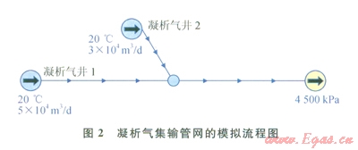 在凝析氣的PVT分析報告中,通常提供的是凝析氣井井流物中天然氣和凝析油的組成分析數(shù)據(jù),并未將水組分納入其中,因此,計算前需將天然氣、凝析油和水按照現(xiàn)場實際產(chǎn)量進行混合,得到完整的井流物組分數(shù)據(jù),并以此作為組分模型的輸入,然后開展模擬計算分析。利用PIPHASE搭建的組分合成模擬和管網(wǎng)系統(tǒng)模擬的流程如圖1、2所示,利用該流程即可開展模擬計算。