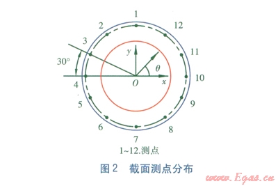 分別對垂直安裝與水平安裝的供熱管道進行測溫,截面設12個測點(見圖2),12個測點均勻分布,測點與絕熱層外表面的距離為20mm,所選擇的測溫截面的絕熱材料比較均勻。垂直與水平兩種安裝方式下的測點溫度見表1。由表1可知:對于垂直安裝供熱管道,l2個測點的平均溫度為37.18℃。對于水平安裝供熱管道,12個測點的平均溫度為37.85℃。對于兩種安裝方式,雖然測點平均溫度基本一致,但是水平安裝供熱管道測點l的溫度最高,比測點7的溫度高9.2℃,這說明水平安裝供熱管道的絕熱層熱導率有明顯的方向性。