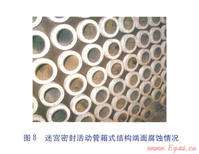 經(jīng)研究,認為采用非金屬材料的迷宮密封結構可以有效消除縫隙腐蝕的發(fā)生,迷宮密封活動管箱式結構見圖7。鍍搪瓷鋼管穿入迷宮密封套中(內(nèi)環(huán)面加工有迷宮鋸齒槽),迷宮鋸齒槽與鋼管外表面形成若干道迷宮腔,從而實現(xiàn)了密封。迷宮密封活動管箱式結構不但具有端面填料函密封的活動管箱式結構的優(yōu)點,還由于換熱管與箱體板之間有柔性迷宮密封套隔離,避免了在安裝、運行過程中對搪瓷層的破壞,從本質上消除了縫隙腐蝕的發(fā)生[5]。經(jīng)技術改造后的空氣預熱器,連續(xù)運行2年后運行狀況依然良好,箱體板及換熱管各部位基本上沒有發(fā)生腐蝕(見圖8、9)。