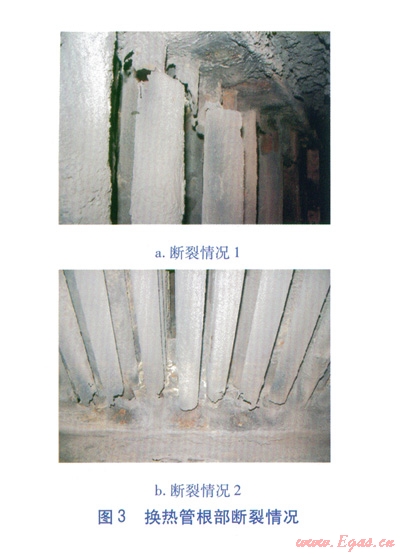 根據(jù)以上分析,課題小組選用抗腐蝕性能較高的ND鋼(09CrCuSb)對換熱管進行改造,仍采用整體焊接的固定管箱式結構。但改造后,5~10個月?lián)Q熱管根部再次出現(xiàn)了斷裂。不但使用壽命沒有有效延長,而且由于ND鋼的價格較高,導致成本急劇增加。