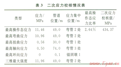 2)二次應(yīng)力遠(yuǎn)小于一次應(yīng)力,二次應(yīng)力只占管道綜合應(yīng)力的2.88%,所占比例很小。由于二次應(yīng)力反映的是溫度對管道應(yīng)力的影響,故在試壓工況下,溫度對管道應(yīng)力的影響很小,可以忽略不計。