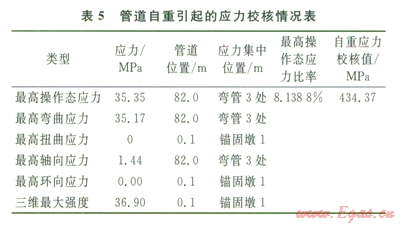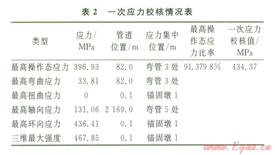 由表2~5可知,最高操作態(tài)綜合應(yīng)力產(chǎn)生在管道彎管3處,管道系統(tǒng)單元l70~180即管道76~82m處的最高操作態(tài)應(yīng)力為397.46MPa,最高操作態(tài)應(yīng)力比率為91.5034%,綜合應(yīng)力主要產(chǎn)生在彎管3處,一次、二次應(yīng)力及綜合應(yīng)力校核最高節(jié)點應(yīng)力均未超過434.37MPa,滿足管道的強(qiáng)度和柔性要求。