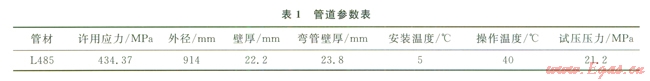 以XX隧道穿越管道為例,根據(jù)SY/T0015.1-1998《原油和天然氣輸送管道穿跨越工程設(shè)計規(guī)范穿越工程》6.2.2計算得到管道的試壓壓力為21.2MPa,試壓介質(zhì)為清水,試壓溫度為20℃,輸氣管道的工作溫度為40℃,建立試壓工況下的應(yīng)力分析模型。表l為該管道的參數(shù)表。