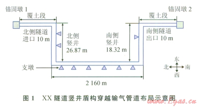 根據(jù)XX隧道穿越管道設(shè)計資料,隧道穿越的總長度為2246.7m,隧道內(nèi)全部采用露空與管架支撐形式,在隧道進(jìn)口和出口處分別設(shè)置錨固墩l和錨固墩3,用以截斷隧道外管道對隧道內(nèi)管道的影響。隧道進(jìn)口豎井深度為26.87m,支吊架2個(第1個支吊架距隧道進(jìn)口處5.4m),2個支吊架間距為2.816m;平巷長度為2160m,平巷內(nèi)設(shè)置支墩,支墩間距為l2m,共設(shè)置支墩l81個;隧道出口豎井深度為18.32m,支吊架l個(距隧道出口處6.624m);管道彎管處的曲率半徑為6D(D為管道外徑)。管道的材料為L485,管徑為914mm,壁厚為22.2mm,彎管壁厚為23.8mm。根據(jù)式(1)計算得到試驗壓力(pt)為21.2MPa。XX隧道豎井盾構(gòu)穿越輸氣管道具體布局如圖1所示。