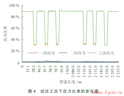 3)一次應(yīng)力占管道綜合應(yīng)力的97.12%,故占管道應(yīng)力的大部分。同時,在管道自重對一次應(yīng)力影響的校核中,管道自重占一次應(yīng)力的8.9%,所占比例較小。因此,管道內(nèi)壓是產(chǎn)生一次應(yīng)力的主要因素。在一次應(yīng)力校核中發(fā)現(xiàn)應(yīng)力集中點在管道彎管3處,由于一次應(yīng)力反映的是管道內(nèi)壓和管道以及管內(nèi)介質(zhì)的自重對管道應(yīng)力的影響,因此,在試壓工況下,影響管道應(yīng)力的最主要因素是管道內(nèi)壓。