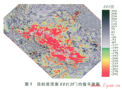 圖5為從反演得到的EEI(25°)屬性沿目的層頂面開l0ms時(shí)窗提取的算術(shù)平均值平面圖,圖中綠色到紅色對應(yīng)EEI值小于-l50,并且顏色從綠色到紅色對應(yīng)的EEI值逐漸降低。結(jié)合本區(qū)的鉆井情況和構(gòu)造形態(tài)可知,圖5中紅色異常范圍(即EEI值小于-150的范圍)與該層鉆井證實(shí)的含氣范圍吻合好。在EEI屬性平面圖上,鉆遇水層的E9井處EEI屬性表現(xiàn)為水層特征,而其他含氣性好的井則對應(yīng)相對低的EEI值,這說明利用EEI屬性能有效地區(qū)分出氣層和水層。另外,A9井區(qū)物性較好的位置主要集中在構(gòu)造高部位,即A9井的周圍,但是分布的范圍較小,這可能就是A9井生產(chǎn)過程中壓力下降較快的一個原因。