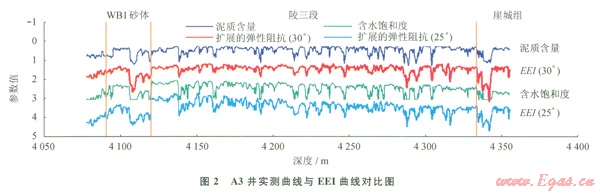 圖2為相應(yīng)角度的EEI曲線與實(shí)測的泥質(zhì)含量曲線(Vsh)、含水飽和度(Sw)曲線的比較圖,從圖2中可以看出,EEI(30°)與泥質(zhì)含量曲線具有很好的一致性,而EEI(25°)與含水飽和度曲線具有很高的相似度,氣田內(nèi)的其他井也具有類似的情況。