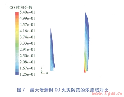 C0是CRG的主要叮燃組分,在12.5%~74.0%的爆炸極限范圍內均可燃,且其密度與空氣相近,泄漏后較難快速散失,會混入地面空氣中產(chǎn)生橫向蔓延,因此研究考慮的C0防火控制體積分數(shù)取其爆炸下限l2.5%,即低于該含量均屬安全。