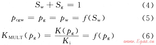 式(2)中包含了4個基本變量:pg、pw、Sg、Sw。為了完整地描述方程,還需3個附加的輔助關(guān)系式: