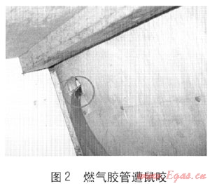 2010年11月5日,溫州市區(qū)康泰大廈一住戶廚房內發(fā)生一起燃氣爆炸事故,造成1人受傷、2戶建筑受損,爆炸原因系老鼠咬破膠管引發(fā)燃氣泄漏。膠管被鼠咬是用戶家中安全用氣的最大隱患之一,每年冬春兩季鼠患最為嚴重。統(tǒng)計數(shù)據(jù)顯示,2009年公司供氣區(qū)域內發(fā)生230起有關膠管隱患處警,其中膠管被鼠咬有76起;2010年共發(fā)生有關膠管隱患處警200起,其中膠管被鼠咬有93起,進而發(fā)生爆燃的有5起。通常用戶家里所使用的燃氣膠管為橡膠軟管,易被鼠咬(見圖2),用戶在不知道的情況下開啟灶具開關就會產生爆炸、爆燃等事故。