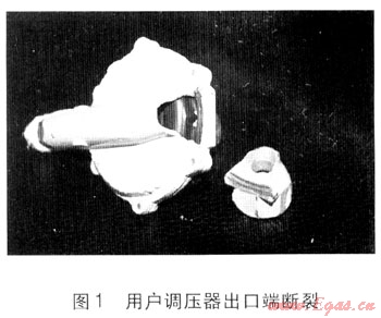 調壓器本體泄漏,包括本體進出口端開裂、斷裂(見圖1)、閥蓋破裂、本體與螺紋接頭處泄漏等。調壓器本體所用材質主要是生鋁,韌性不足,閥體厚度(約2mm左右)不足,制造工藝缺陷造成調壓器本身質量問題;其次,本體與螺紋接頭采用金屬膠粘合連接,其強度較低,如果安裝人員沒有正確安裝操作,會導致粘合部位受損或嚴密性達不到要求;再次,由于采用硬連接,隨環(huán)境溫度變化和建筑物沉降,調壓器連接處發(fā)生伸縮彎曲而受應力作用,從而造成泄漏。