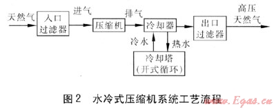天然氣從入口過濾器進(jìn)入壓縮機(jī),增壓后的氣體進(jìn)入換熱器列管中,與列管外的冷水進(jìn)行換熱,冷水把氣體放出的熱量吸收并帶走至風(fēng)冷卻器,冷卻系統(tǒng)完全封閉,循環(huán)水在冷熱交換時(shí)不和環(huán)境空氣接觸,熱水被風(fēng)冷卻器風(fēng)扇強(qiáng)制冷卻,降溫后的冷卻水通過水泵循環(huán)至換熱器。高壓天然氣被冷卻后,通過出口過濾器,流進(jìn)下一步工序。