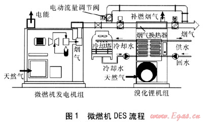 微燃機DES由微燃機發(fā)電機組、煙氣補燃型溴化鋰吸收式機組(以下簡稱溴化鋰機組)、冷卻塔等組成,見圖1。天然氣在微燃機燃燒室內(nèi)燃燒,熱能轉(zhuǎn)換為高品位電能輸出,煙氣引入溴化鋰機組,利用煙氣余熱生產(chǎn)冷水或熱水。當(dāng)煙氣余熱量不足以滿足空調(diào)負荷或供暖負荷時,利用天然氣補燃以提高溴化鋰機組的制冷或制熱能力。