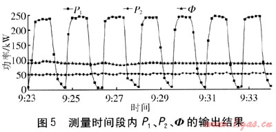 測量時間段內(nèi)qg1、qg2的測量結(jié)果見圖3 pf1,pf2的測量結(jié)果見圖4。上述運行參數(shù)均屬一次運行參數(shù),微燃機發(fā)電機組燃氣化學(xué)熱功率P1、溴化鋰機組補燃燃氣化學(xué)熱功率P2、溴化鋰機組制熱量Φ等屬于二次計算數(shù)據(jù),這些二次計算數(shù)據(jù)由CAT系統(tǒng)計算輸出,部分輸出結(jié)果見圖5。