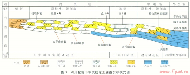龍王廟期從盆地的西部到奉節(jié)—石柱—三匯—古藺一線發(fā)育內(nèi)緩坡相。盆地內(nèi)陸源物質(zhì)含量少,僅在盆地西部和西北部有少量沉積,發(fā)育潮坪亞相,主要巖性為紫紅色、褐灰色、灰色泥巖、砂巖,深灰色泥質(zhì)云巖、泥質(zhì)泥晶云巖,沉積動(dòng)力以潮汐的作用為主,能量一般不強(qiáng);川東凹陷區(qū),屬于內(nèi)緩坡的低洼地帶,因受兩側(cè)隆起區(qū)阻擋作用,水體循環(huán)不暢,以靜水沉積為主,鹽度略高,局部地區(qū)甚至出現(xiàn)咸化和蒸發(fā)作用,巖性以灰色、深灰色泥粉晶云巖、含泥質(zhì)條帶泥晶云巖為主,部分地區(qū)發(fā)育膏巖、鹽巖(如臨7井);川中川西寬緩隆起區(qū),是內(nèi)緩坡顆粒灘發(fā)育的主要地區(qū)。隆起區(qū)地形相對(duì)較高,在波浪、潮汐的作用下,水體能量較強(qiáng)的位置發(fā)育顆粒灘,巖性以灰色、深灰色亮晶砂屑云巖、殘余砂屑云巖、殘余礫屑云巖,以及細(xì)晶云巖為主,見(jiàn)少量鮞粒云巖及生屑云巖,交錯(cuò)層理發(fā)育,為顆粒灘亞相;在整個(gè)隆起區(qū),顆粒灘亞相與灘間海亞相具體發(fā)育區(qū)域很難加以區(qū)分,在橫向上多表現(xiàn)為灘間海發(fā)育于顆粒灘之間,縱向上夾于大套顆粒灘之間。灘間海亞相水體環(huán)境相對(duì)安靜,以細(xì)粒沉積為主,由生物擾動(dòng)泥晶云巖、含不規(guī)則泥質(zhì)紋層泥晶云巖和扁條狀泥晶云巖組成,發(fā)育條帶狀構(gòu)造、生物擾動(dòng)斑、生物潛穴構(gòu)造等是該亞相的典型特點(diǎn)。