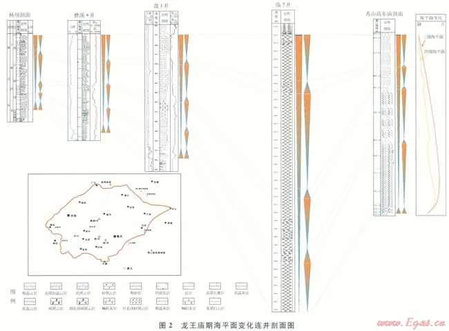 碳酸鹽巖沉積作用對(duì)相對(duì)海平面變化的響應(yīng)極為敏感,相對(duì)海平面升降發(fā)生變化,沉積巖性就有所不同,表現(xiàn)出不同的旋回序列[28]。為此,選取3 口井進(jìn)行巖心觀察并踏勘實(shí)測(cè)2條野外剖面,對(duì)龍王廟組沉積巖性組合進(jìn)行了分析,劃分單井、野外剖面沉積旋回,對(duì)連井剖面上的沉積旋回進(jìn)行橫向?qū)Ρ龋源藖?lái)反映海平面的變化情況(圖2)。如圖2所示,整個(gè)龍王廟期海平面都具有快速海侵、低速海退的特點(diǎn),次級(jí)海平面變化特征也一致。